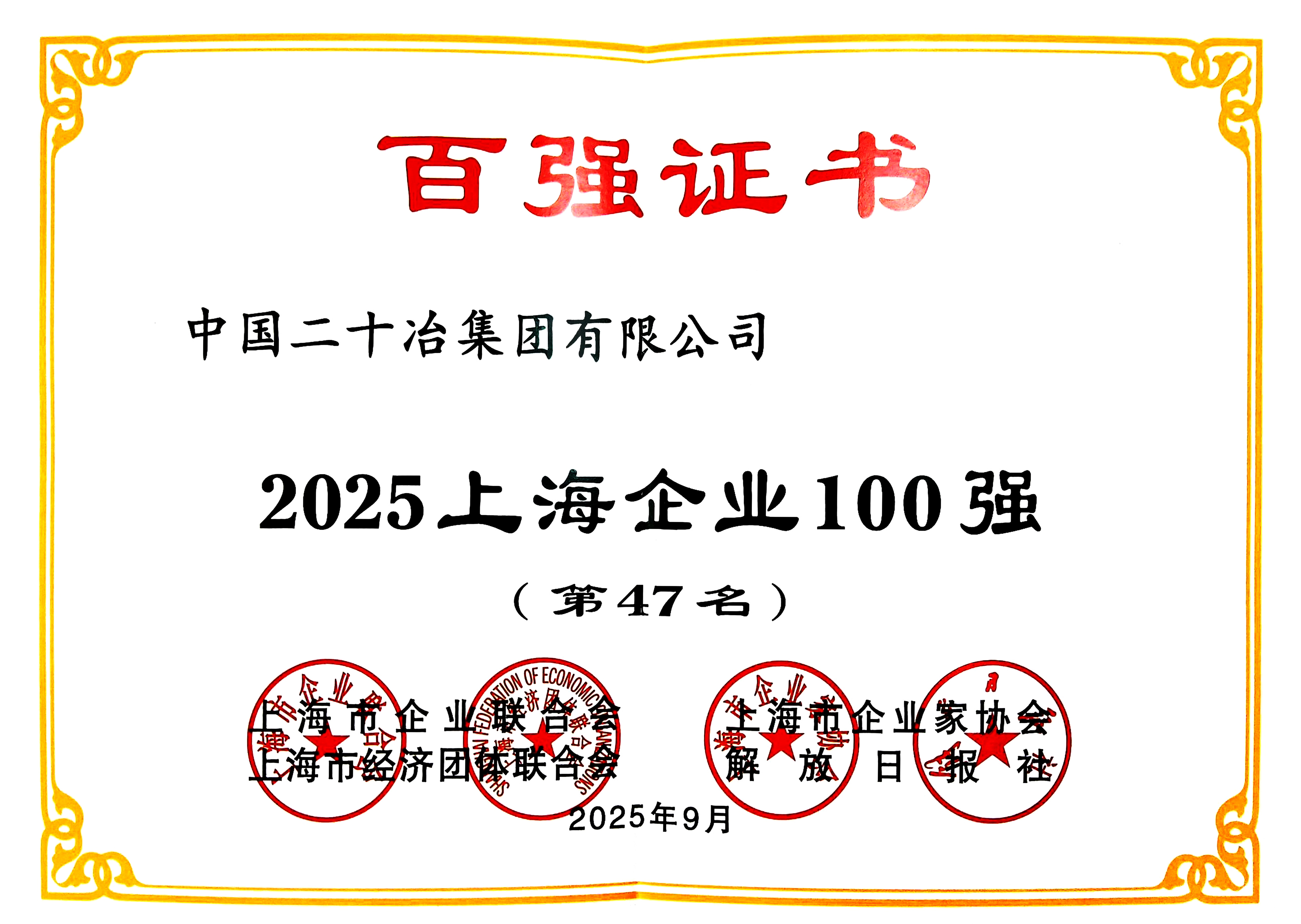 9月23日,上海發(fā)布百?gòu)?qiáng)企業(yè)榜單,中國(guó)二十冶在此次評(píng)選中榮獲2025上海企業(yè)100強(qiáng),第47名,這是中國(guó)二十冶連續(xù)七年上榜,彰顯了公司在建筑業(yè)方面的經(jīng)營(yíng)實(shí)力。