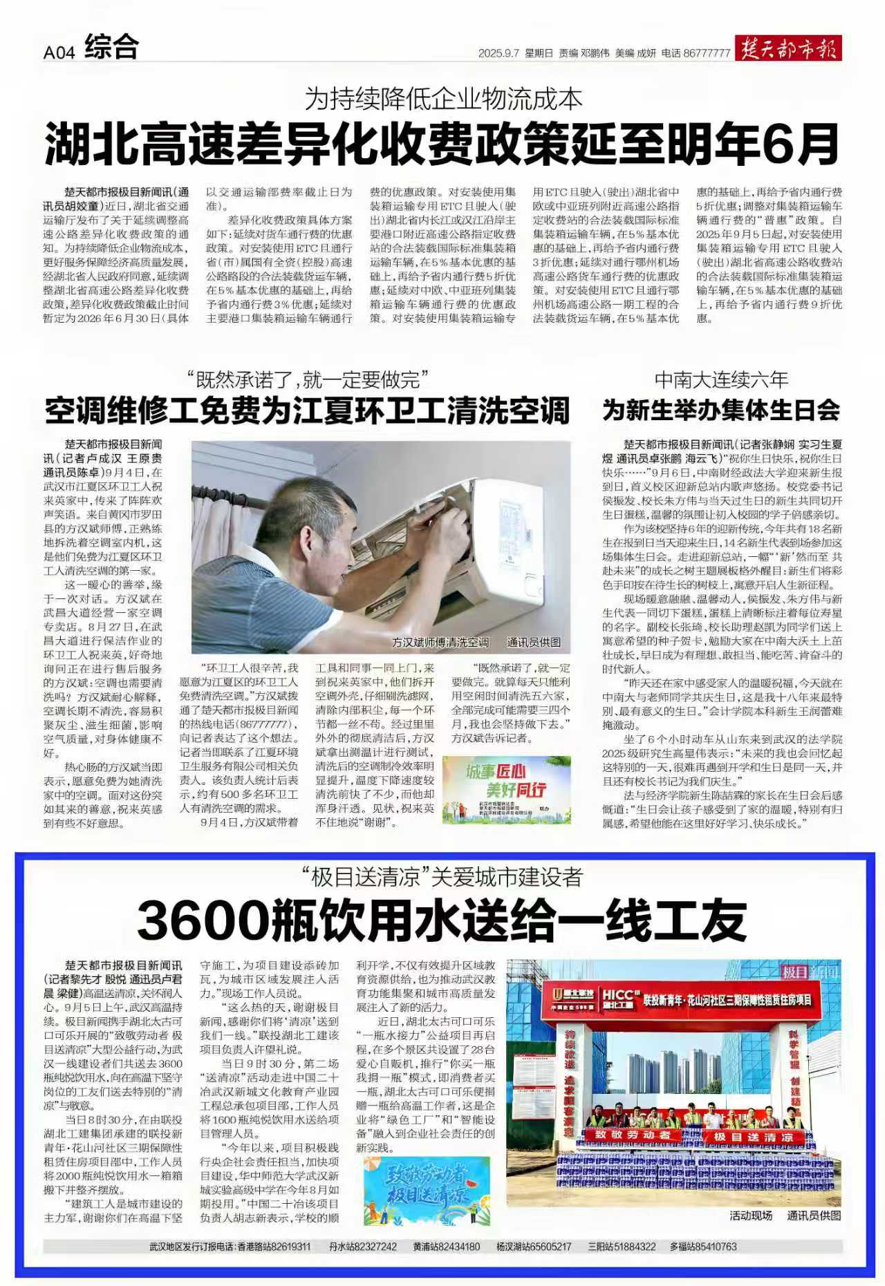 9月7日,湖北《楚天都市報》以《“極目送清涼”關愛城市建設者》為題,報道了湖北二十冶承建的武漢新城文化教育產業園項目。