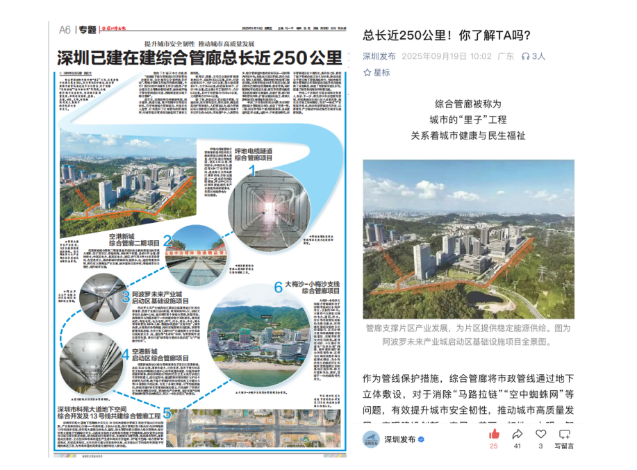 管廊總長(zhǎng)近250公里”為題,在A6專題整版報(bào)道了深圳二十冶承建的多個(gè)管廊項(xiàng)目。“深圳發(fā)布”(深圳市人民政府新聞辦公室)以“總長(zhǎng)度近250公里!你了解TA嗎?”為題迅速轉(zhuǎn)發(fā)。