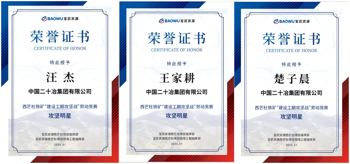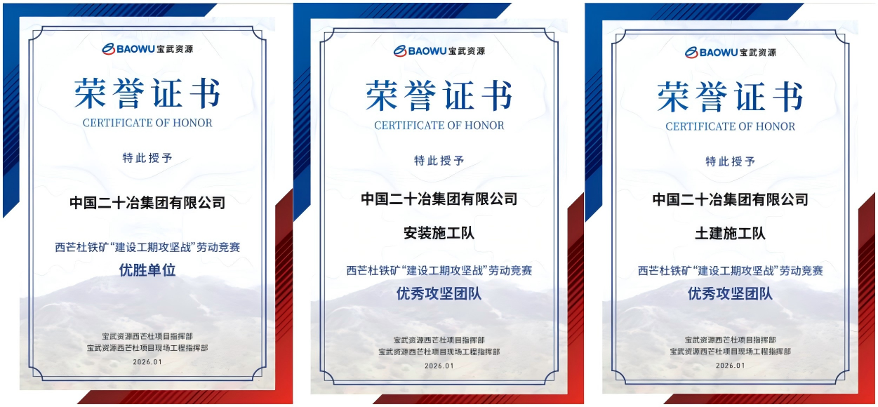 1月26日,海外公司贏聯(lián)盟西芒杜礦山項目部榮獲業(yè)主頒發(fā)的“優(yōu)勝單位” “優(yōu)秀攻堅團(tuán)隊”榮譽(yù),三名項目部員工榮獲“攻堅明星”的稱號,充分展現(xiàn)了業(yè)主對中國二十冶項目管理團(tuán)隊攻堅成果的高度認(rèn)可。