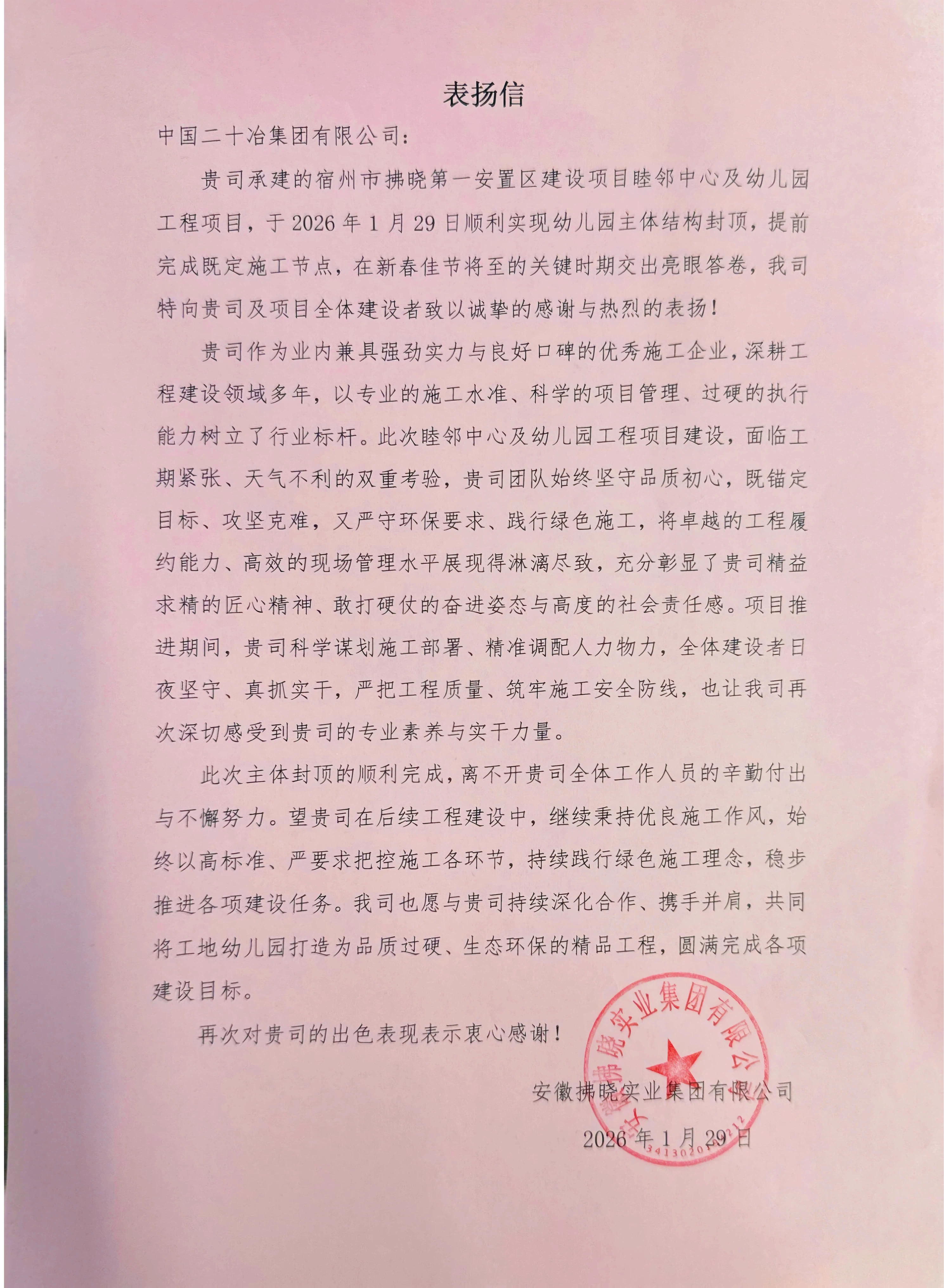1月31日,安徽二十冶承建的宿州市拂曉第一安置區建設項目睦鄰中心及幼兒園工程項目收到業主單位安徽拂曉實業集團有限公司發來的表揚信。
