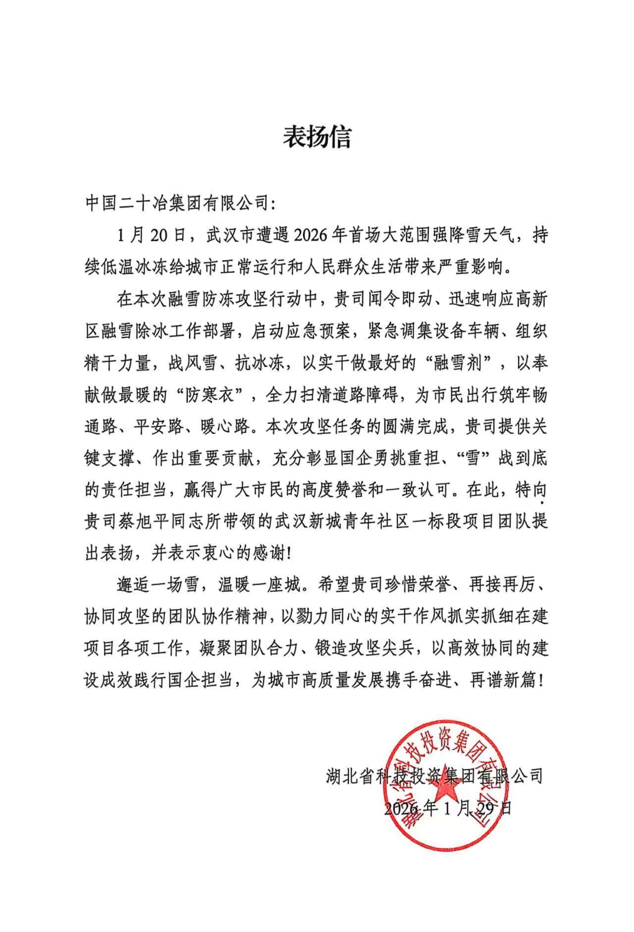 2月2日,湖北二十冶武漢新城青年社區項目收到來自湖北省科技投資集團有限公司的“表揚信”。在武漢市遭遇2026年首場降雪、交通面臨嚴峻考驗的關鍵時刻,項目積極投身融雪防凍攻堅行動,迅速響應和高效處置得到了業主公司的高度認可,信中特別表揚了項目團隊在應急保障中的責任擔當與突出貢獻。