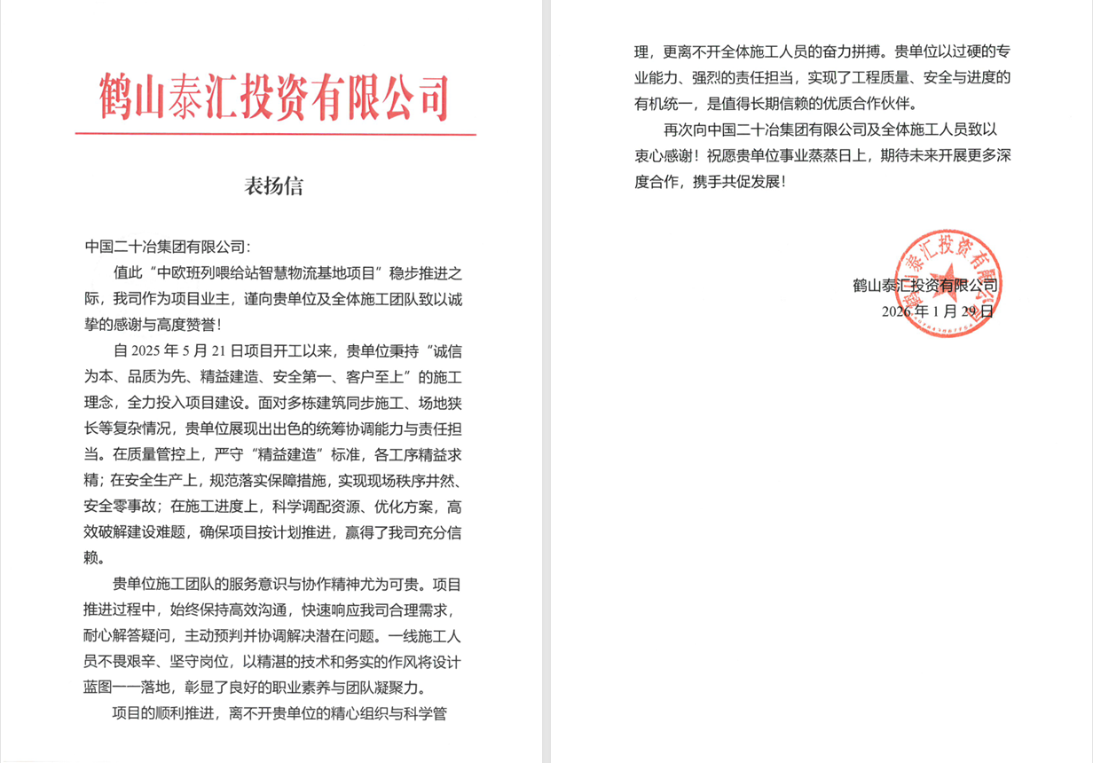 1月29日,由深圳二十冶承建的中歐班列喂給站智慧物流基地項目收到了業主單位鶴山泰匯投資有限公司發來的表揚信。這封滿載肯定的信件,是對項目團隊專業能力的高度認可。