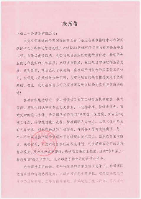 2月4日,上海二十冶承建的陜西國際體育之窗賽事場館改造提升六標段-D區工程施工項目收到表揚信。