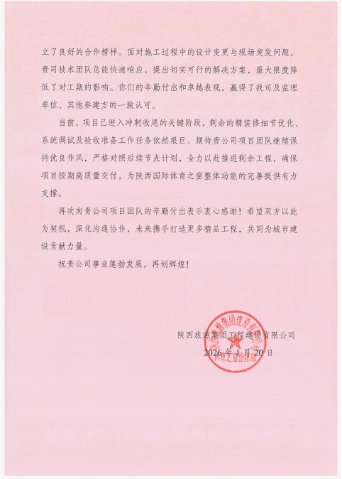 來信表示,自開工建設以來,項目團隊以高度的責任感、精湛的專業能力和扎實的工作作風,克服多重挑戰,推動項目建設取得顯著進展。在項目實施過程中,室內精裝修及安裝工程涉及機電安裝、裝飾裝修、設備調試等多專業交叉作業,工藝標準高、協調難度大。面對復雜的施工條件,項目團隊始終秉持“保質量、保進度、保安全”的核心理念,科學規劃施工流程,精準調配人力物力,確保項目高質量推進,充分彰顯了責任與擔當。